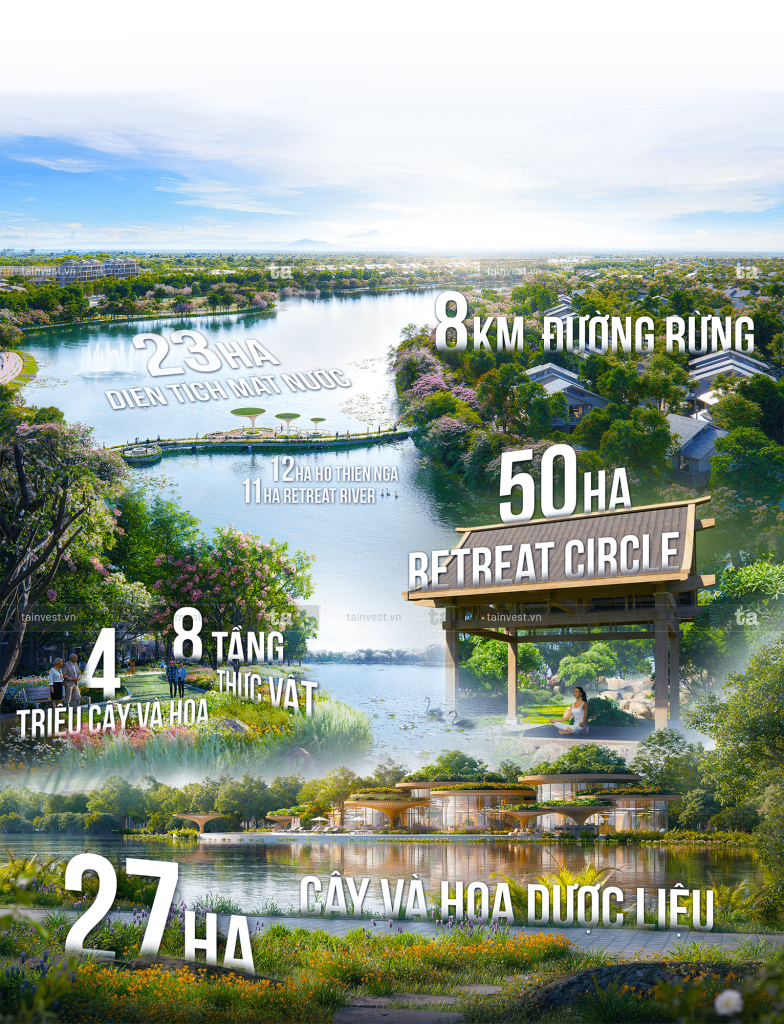 Những con số về cây xanh ở Eco Retreat đọc một lần bạn cũng đã có thể tưởng tượng ra được không gian bạn sẽ sống sẽ tươi mát thế nào, bạn cảm thấy tuyệt vời, tràn đầy năng lượng khi được sống tại đây