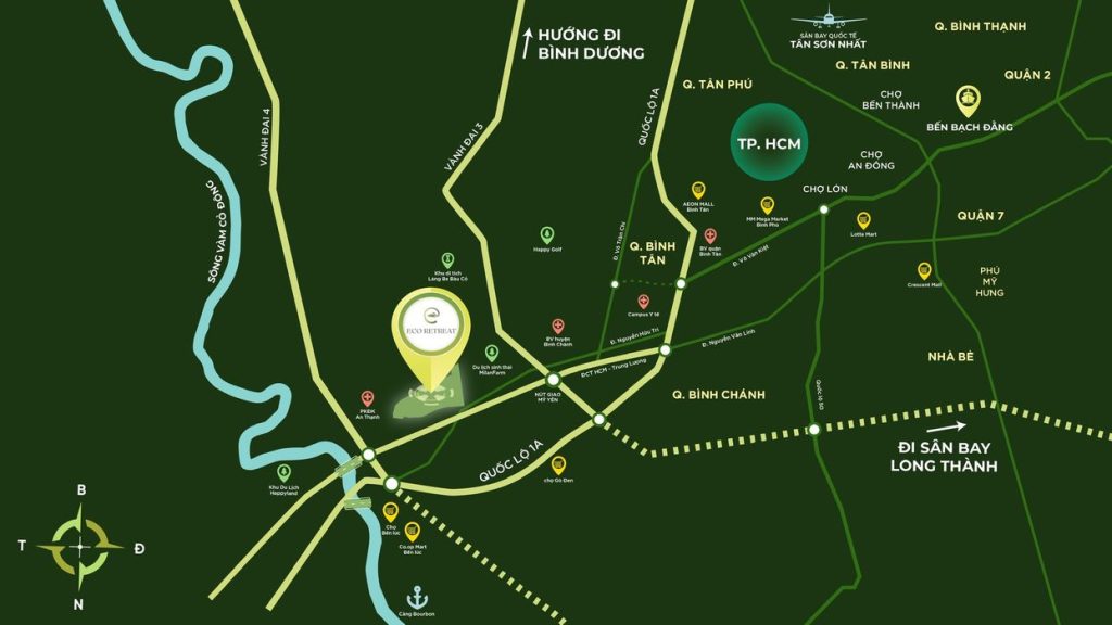 Nằm giữa đường Vành đai 3 và vành đai 4, kế cận là đường cao tốc TPHCM – Trung Lương và cao tốc Bến Lức – Long Thành, chỉ cách đường Quốc lộ 1A (QL 1A) 2,5km và Xa Lộ Đại Hàn 3,5km